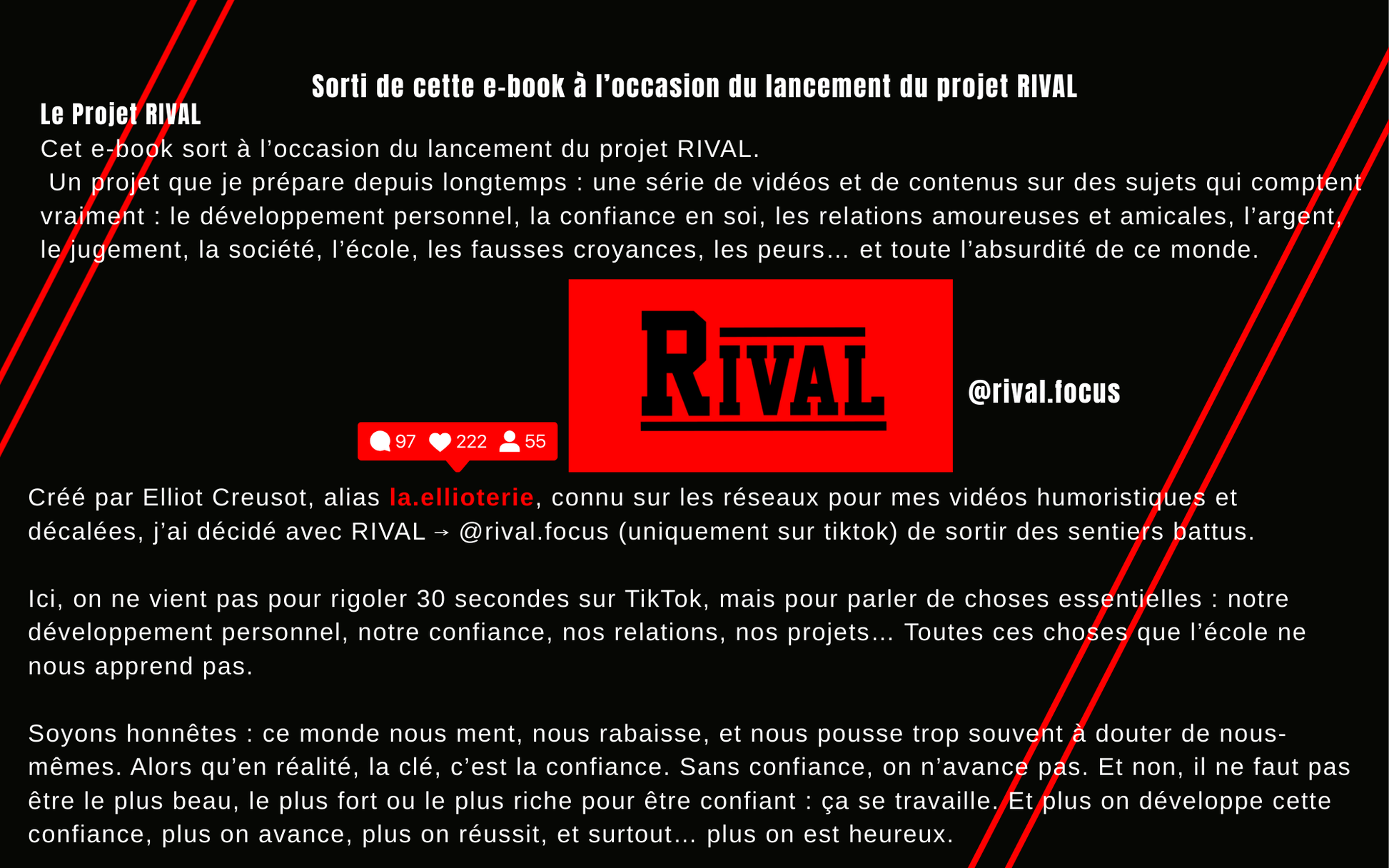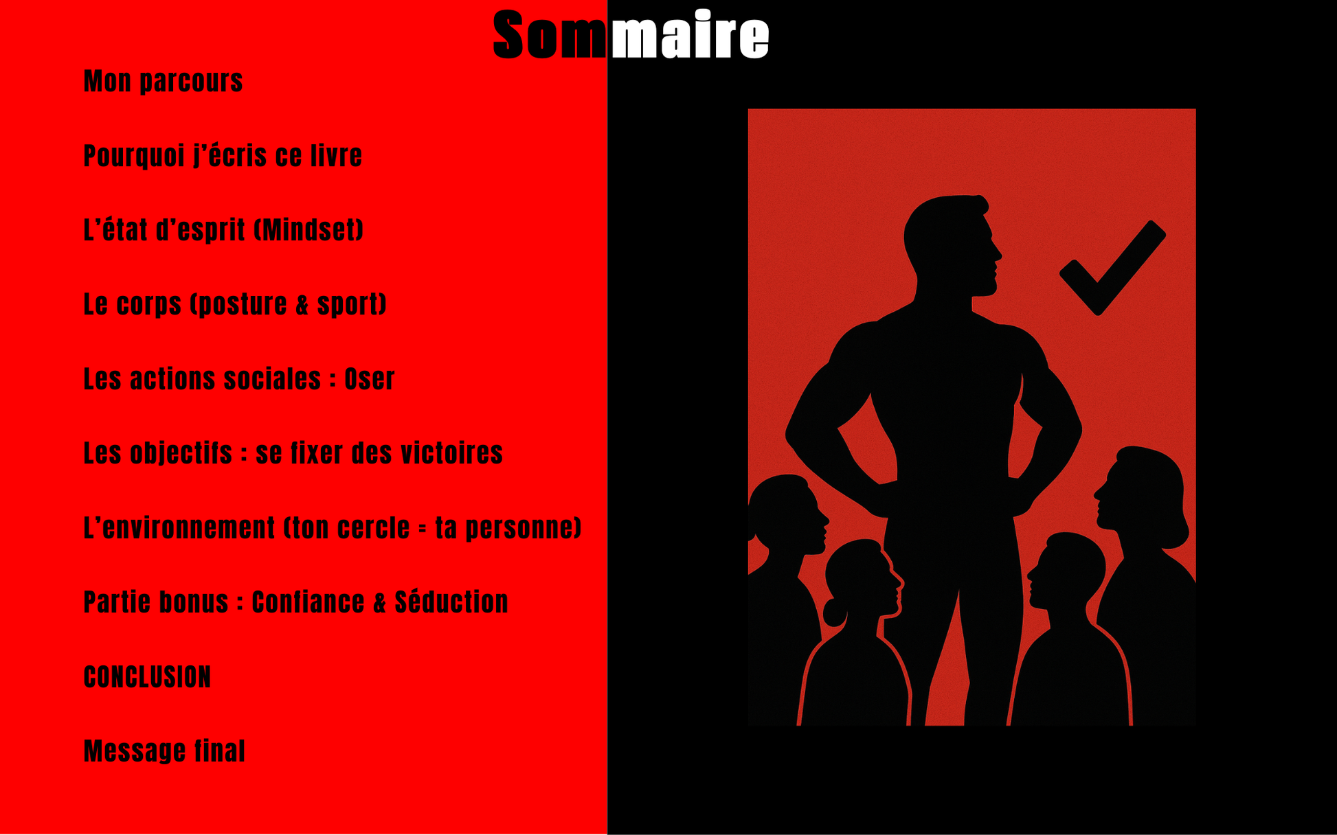 👉 Peu importe que tu sois étudiant, que tu bosses déjà sur un projet, ou que tu cherches simplement à avoir plus d’amis, plus de relations, plus de succès : tu vas te reconnaître dans ces pages. Parce que j’ai moi-même commencé sans aucune confiance, et j’ai construit petit à petit ce qui m’a permis d’en arriver là.